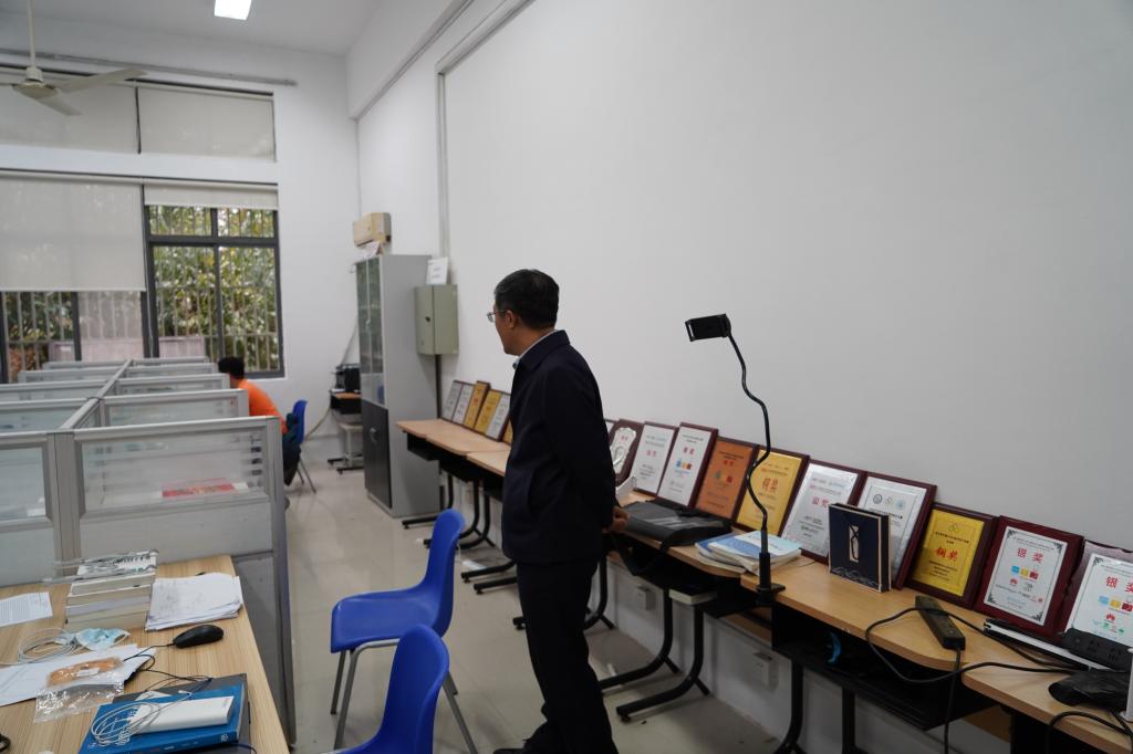 陈校长参观了大学生创新实践基地、实验室、办公室等,刘渊院长介绍了学院搬迁及安置情况。陈校长专门来到王士同教授和王映辉教授办公室,亲切看望了两位二级教授,并与研究生们进行交流,鼓励他们好好学习。