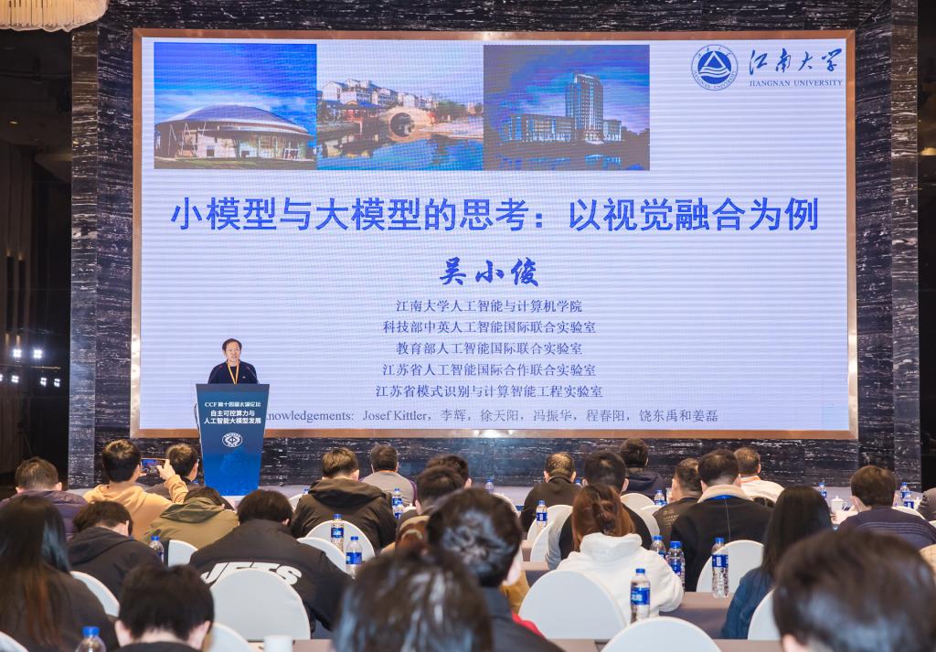 国际模式识别协会会士、江南大学研究生院院长吴小俊做了《小模型与大模型的思考:以视觉融合为例》的主题报告;他阐述了视觉融合中大模型、小模型的应用场景,介绍了团队的科研成果,强调基于不同的场景,既要抓住大模型发展机遇,也要充分利用传统小模型的方法和手段。