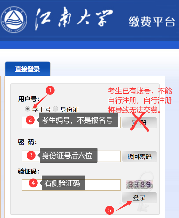 缴费说明:进入复试考生在学院规定的时间内登录“江南大学缴费平台”交纳复试费用,复试收费标准:80元/生。缴费网址://pay.hot91gc.com/payment/。登录账号为准考证上的考生编号,登录密码为身份证后六位(友情提醒:考生账号已开通,切勿自行注册)。按照提示交费(使用网银),并打印或截图保存付费凭证。
