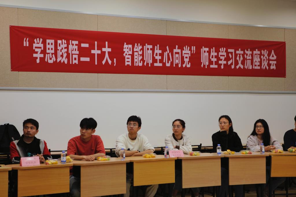“学思践悟二十大,智能师生心向党”师生学习交流座谈会在学院B109召开。学院副院长 (主持工作)方伟、党委书记张华、分团委书记沈丹、辅导员王牧、戴士焱、张海月及学生代表20余人参加了会议。会议由分团委书记沈丹主持。