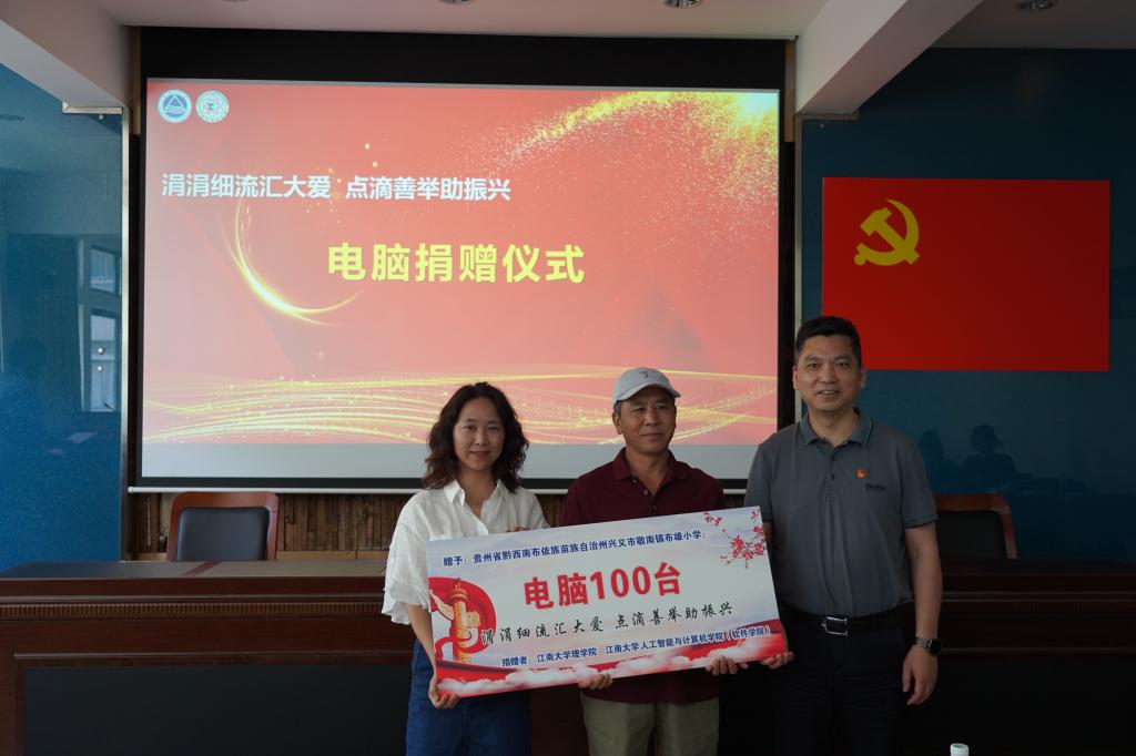 党委书记张华代表两个学院党委向贵州省黔东南布依族苗族自治州兴义市敬南镇布雄小学捐赠电脑100台,理学院退休教授潘正华代表布雄小学接受捐赠。随后,潘正华老师介绍了布雄小学的基本情况,对两个学院在改善学校教学条件、助力学生学习与成长上给予的帮助表达深深的感谢。