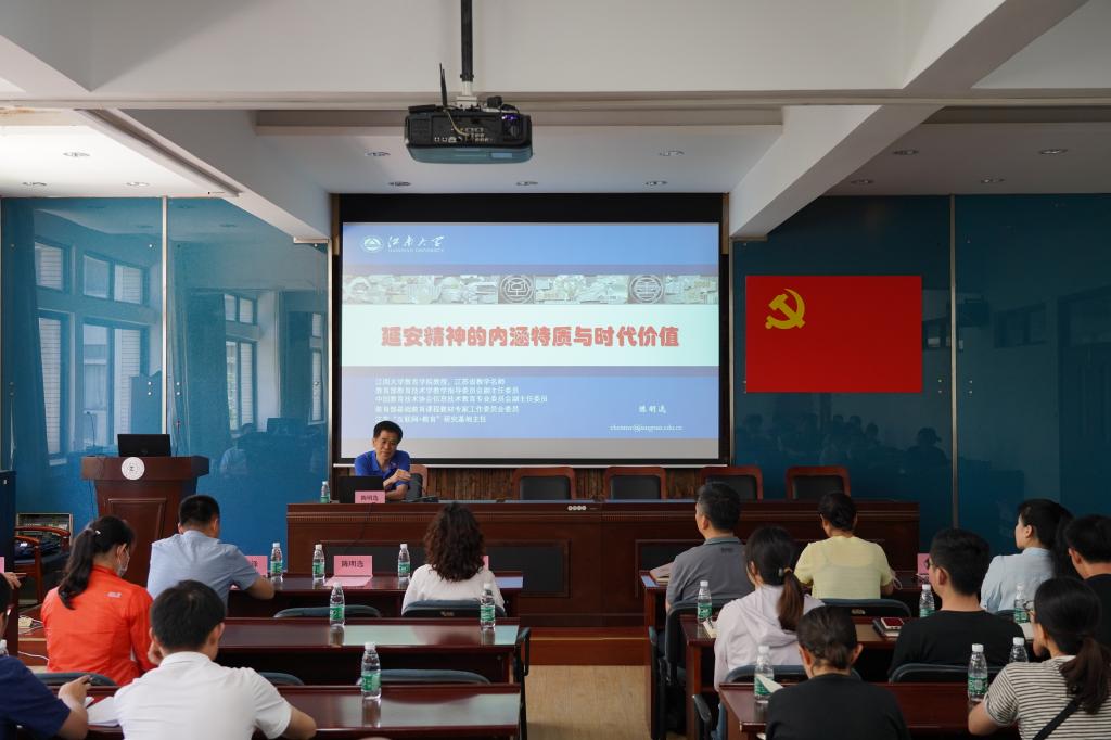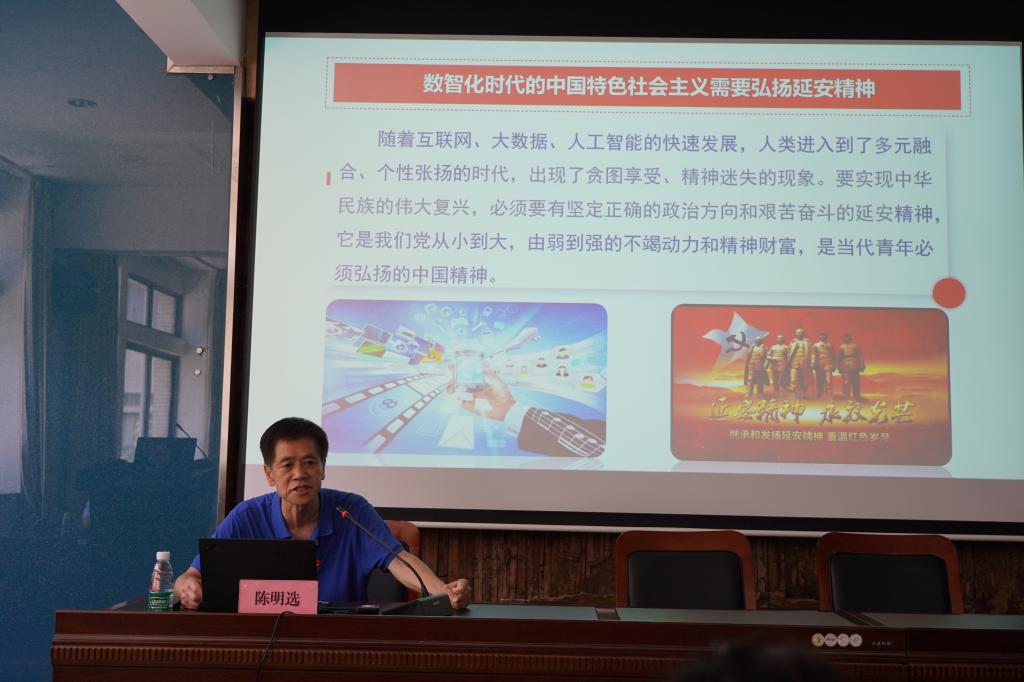 陈明选教授讲授了题为“延安精神的内涵特质与时代价值”的专题党课。他结合自己在延安的经历从延安时期的辉煌业绩、延安精神的内涵特质、延安精神产生的历史条件和延安精神的时代价值四个方面讲述了中国共产党人在革命年代铸就的伟大精神——延安精神。他阐明了延安精神在新时代的价值和意义,强调数智化时代的中国特色社会主义需要弘扬延安精神,追求理想信念、实现自我价值、实现中国梦更离不开延安精神的继承和弘扬。