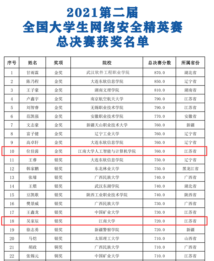 历经1个多月的激烈角逐,2021年第二届全国大学生网络安全精英赛于10月30日圆满落幕,全国2768所高校、300000余名在校生参加了比赛。江南学子凭借扎实的专业知识和顽强的拼搏意志,斩获一金一银。