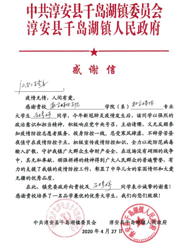 数媒1802班的吕娉婷平时就热心公益,在2月15日到2月17日期间,她参与了浙江杭州千岛湖南苑社区的疫情防控志愿服务。“当时看到社区招募志愿者,我就立马报名参加了,社区给我分配了两个工作日。早上六点,我戴好口罩,站在小区的专门服务点,配合社区的工作人员,对进出小区的人进行登记,查看、核实他们手机上的健康绿码。二月份我们小区进进出出的人并不多,在服务点连续站岗几个小时有点冷也有点累,但是为社区服务真的很开心。”当被问到志愿服务经历时,吕娉婷同学这样说到。当地政府——淳安县千岛湖镇人民政府也向学院发来感谢信,对江南大学和吕娉婷同学表示了由衷的感谢与致敬。