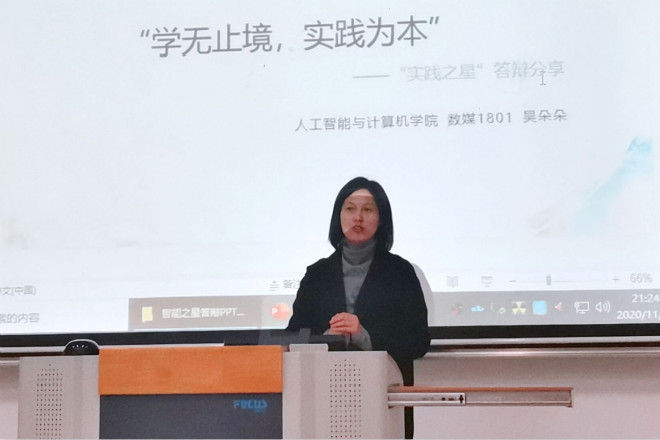 活动伊始,主持人介绍了答辩的规则。随后各候选人按照抽签顺序依次上台进行展示。19名候选人通过精心制作的ppt和视频,向在场的同学和老师进行综合展示的同时,也分享了他们的学习、实践、科研经历等,展现出新时代大学生自信活泼、积极向上的精神面貌,树立了良好榜样,传递着正能量。在场学生备受鼓舞。经过评委现场打分,共有7组同学获得“智能之星”荣誉称号,分别是学习之星资源、陈明炜,励志之星李逸,科创之星王子贤、刘凡团队,文体之星邱国容,实践之星孙成龙、吴朵朵。