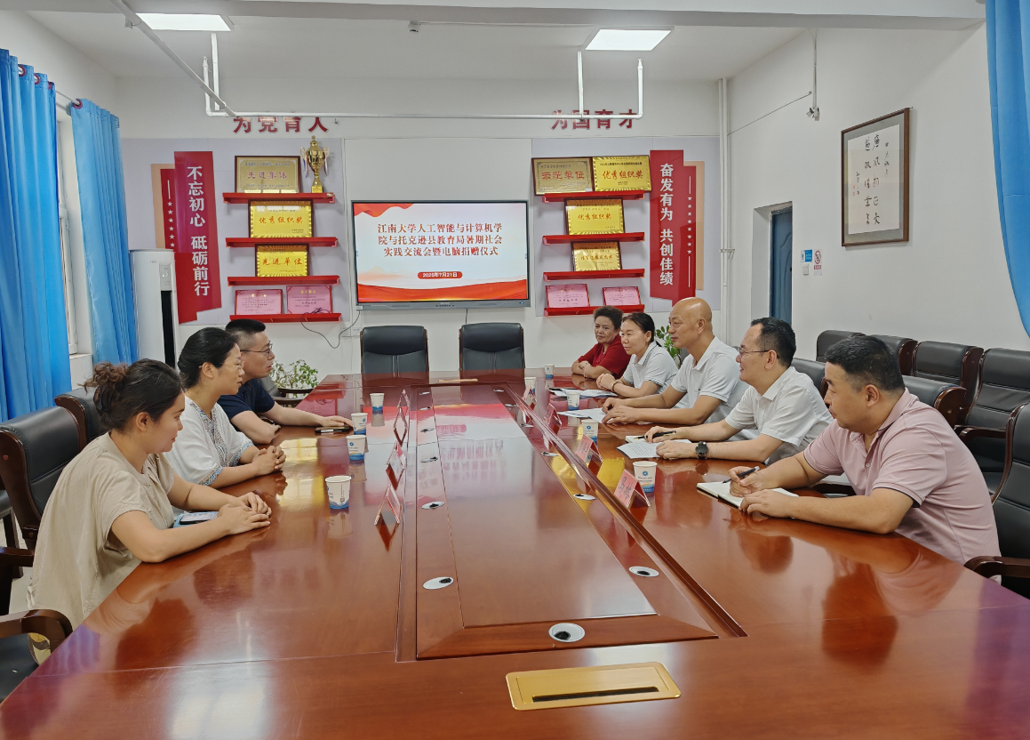 与托克逊县教育局共同开展暑期社会实践交流会暨电脑捐赠仪式。托克逊县县委常委、副县长、教育工委副书记陈海华,县教育局代表、伊拉湖镇中心学校教师代表,江91国产
