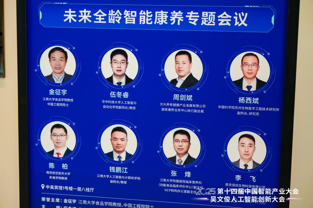 、智能制造学院和康养智能化技术教育部工程研究中心三家单位联合承办的未来全龄智能康养专题会议在常州中吴宾馆成功举行。本次会议是中国人工智能学会主办的2025第十四届中国智能产业大会暨吴文俊人工智能创新大会的分会场之一,专注于关于社会全年龄段人群身心健康的智能化技术、产品、设备、服务等的成果分享和应用探讨。江南大学科研院副院长、教授樊启高,会议主席、华中科技大学人工智能与自动化学院副院长、教授伍冬睿,会议主席、光大养老居家康养业务中心执行副总裁周剑斌,中国科学院苏州生物医学工程技术研究所副所长、研究员杨西斌,南京航空航天大学机电学院教授陈柏,南京佰抗生物科技有限公司联合创始人、副总经理李飞,江南大学附属医院临床营养科副主任、教授张烽,江南大学智能制造学院教授宁萌,江南大学康养智能化技术教育部工程研究中心副主任、91国产