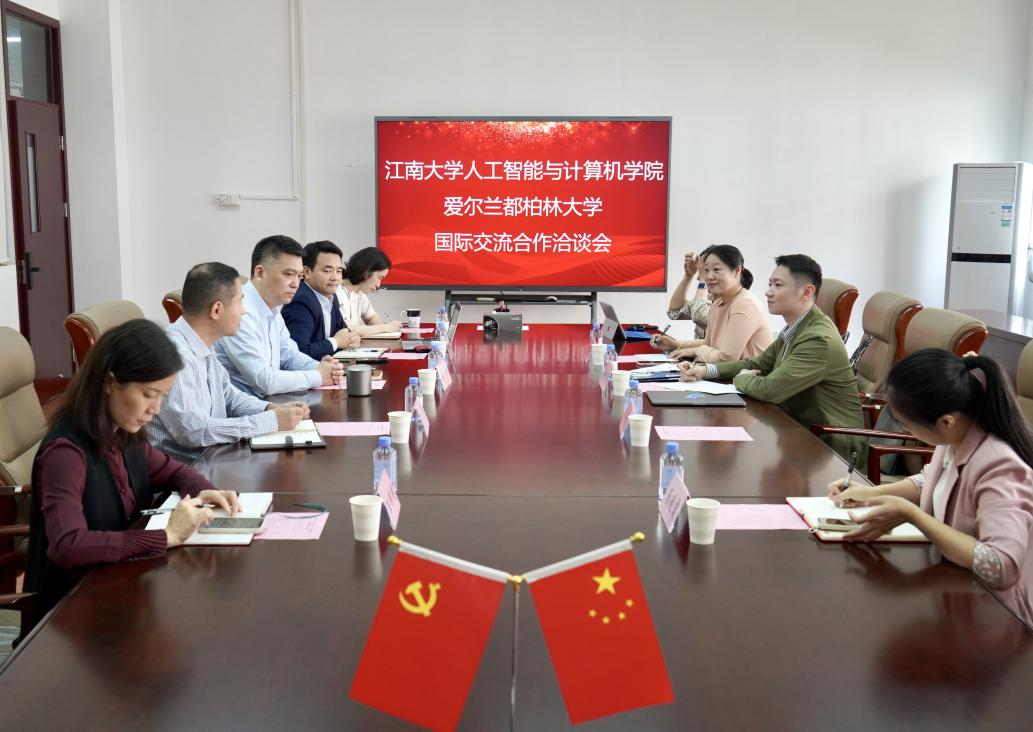 方伟代表学院对俞兆源一行的来访表示热烈欢迎,表达了对与都柏林大学建立深入国际交流合作关系的强烈意愿,明确希望双方在学生联合培养和教师国际交流合作两方面开展实质性工作。俞兆源介绍了爱尔兰在地理位置、社会经济形势、支柱产业、对外开放性、与中国的已有合作等情况,也介绍了爱尔兰都柏林大学在国际地位、学部设置、学科实力、留学申请条件和留学费用等方面的情况,并表明都柏林大学愿意将先前跟江南大学药学院签署的合作协议扩大到校级合作,以支撑江南大学更多学院和学科跟都柏林大学开展合作。钱鹏江较详细地介绍了人工智能学院在发展历程、教师队伍、专业设置、学生培养、科研成果、平台基地和国际交流等方面的情况。蔡建英代表学校职能部门对人工智能学院与都柏林大学开展学生交换访学、本硕连培及教师科研合作等项目形式表示全力支持,表示学校愿意做好双方的桥梁纽带,积极促成双方更多、更大的项目成果。