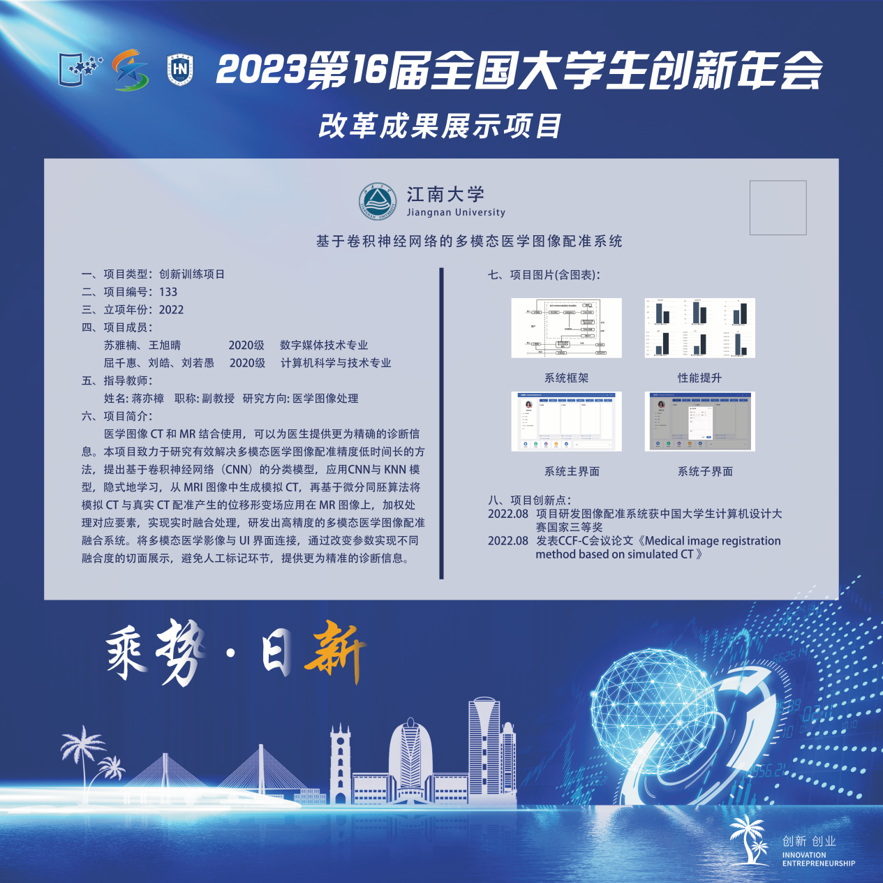 学生苏雅楠创新训练成果《基于卷积神经网络的多模态医学图像配准系统》(指导老师:蒋亦樟)、张俊杰创新训练成果《基于深度学习的新能源车用动力电池管理系统开发》(指导老师:王子赟)两个项目入选改革成果展示,是人工智能学子在创新创业领域取得的又一项重要突破。