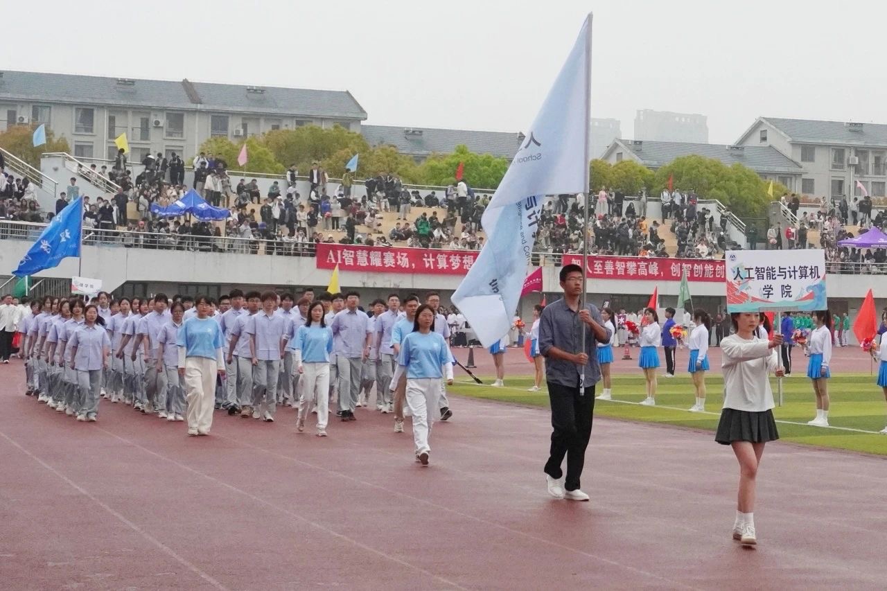 开幕式上,学院45名师生组成的方阵迈着整齐的步伐走过主席台前,大家脸上洋溢着自信的笑容,展现出了学院积极向上的精神风貌。伴随着音乐响起,精心编排的舞蹈表演让在场师生观众眼前一亮,舞步充满活力,动作优美整齐,一举一动都彰显了智能学子的青春活力。