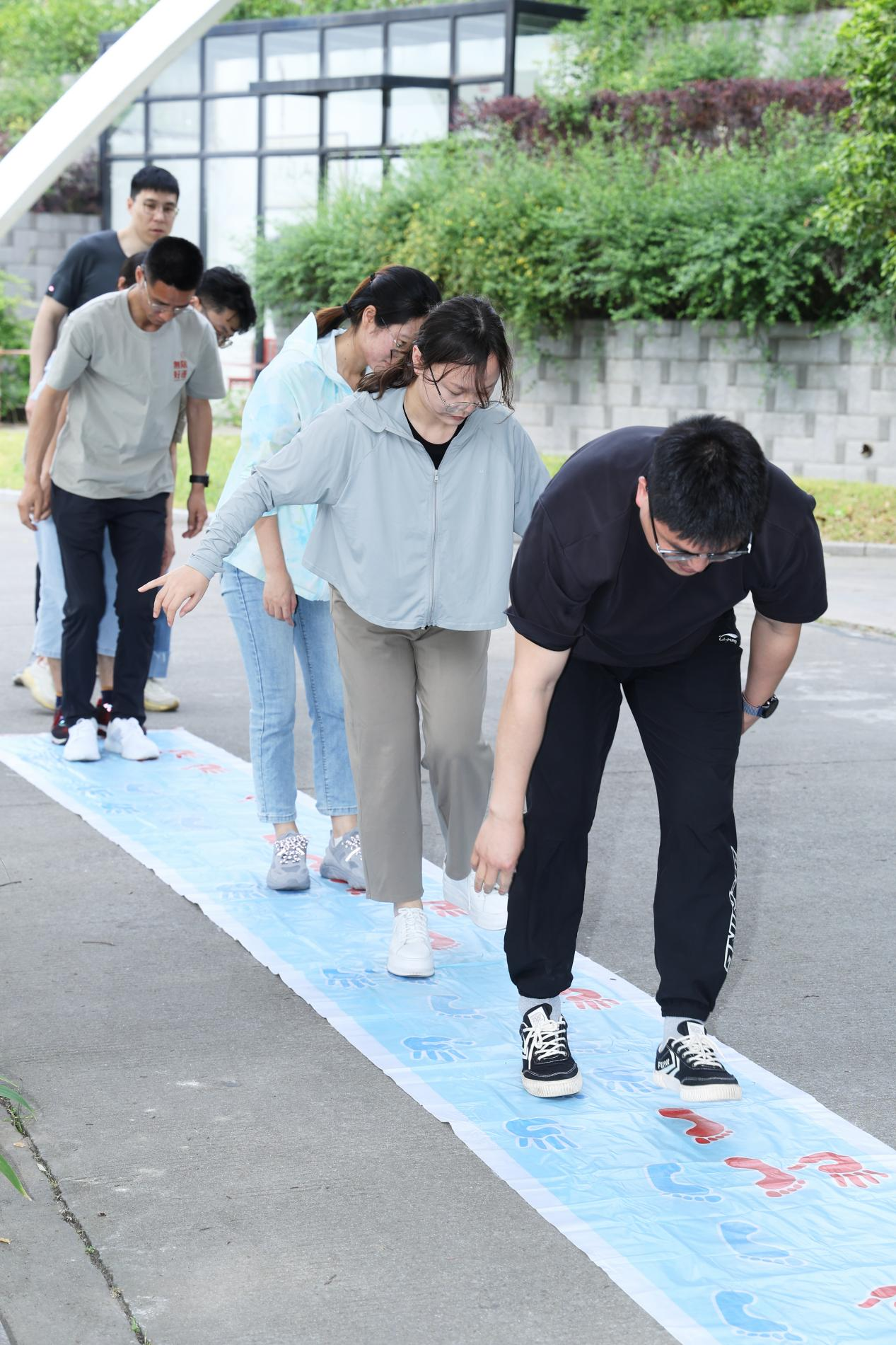 在“手忙脚乱”环节,老师们需要按照喷绘图通道的指示,用身体的不同部位通过特定位置。大家兴致勃勃地挑战身体的灵活性与协调性,整个场地充满了欢声笑语。