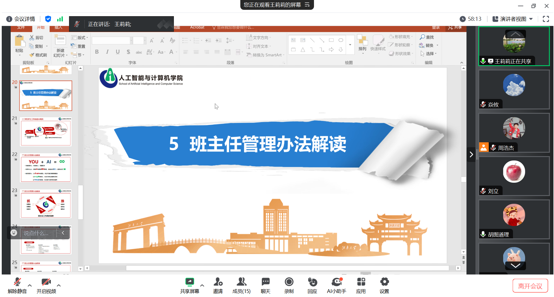 班主任岗位责任书》等文件,理清了班主任的工作职责、工作要求和工作目标。她从工作实际出发,结合案例分享,重点指导了班主任在思想政治教育、安全稳定、学风建设、生涯规划等方面的工作方法,希望班主任以教育者的担当、育人者的情怀、同行者的温度,齐心构建育人矩阵,合力提升育人质量。