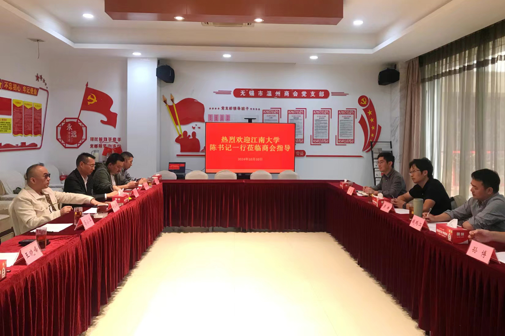 党委书记陈琳、副院长钱鹏江、学工办副主任杜磊,人工智能创新人才培训中心副主任孙博等走访无锡市温州商会。温州商会会长黄会伟,常务副会长马小华、王晓峰、邵海峰等企业家热情接待并参加座谈会。座谈会由商会党支部书记兼秘书长张式义主持。