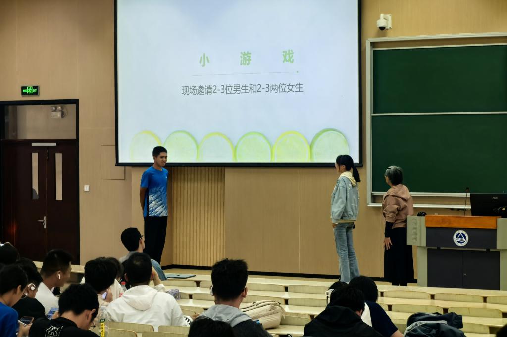 沈力晔老师以心理发展阶段划分为切入点,介绍了心理流派划分、性心理概念、成年人爱情依恋类型和两性健康等知识。她着重围绕如何处理爱情中的矛盾与冲突、如何合理把握恋爱进度等学生关注的重难点问题释疑解惑。讲座中,在理论学习的基础上,沈老师带领学生进行了实践探索,邀请多位学生上台参与游戏“你演我猜”,旨在通过喜闻乐见的活动了解学生入学前对两性交往的认识,引导学生正确认识青春期性心理的不同发展阶段,学会建立和维系健康的两性关系,正确理解爱、表达爱、守护爱。