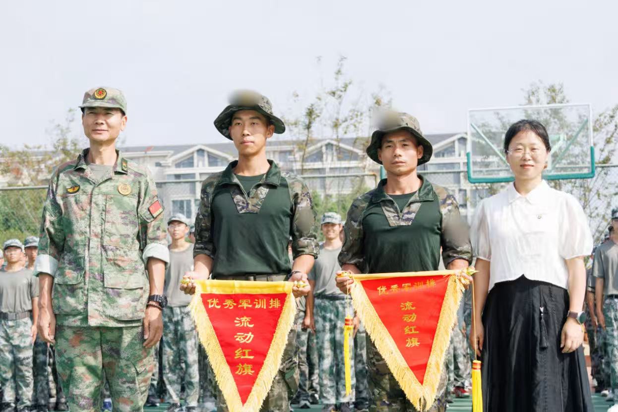 刘璇刚、王莉莉一同为军训优秀排颁发流动红旗,鼓励他们继续保持积极的训练状态,并勉励其他排的同学向他们看齐,在接下来的军训中奋勇争先。