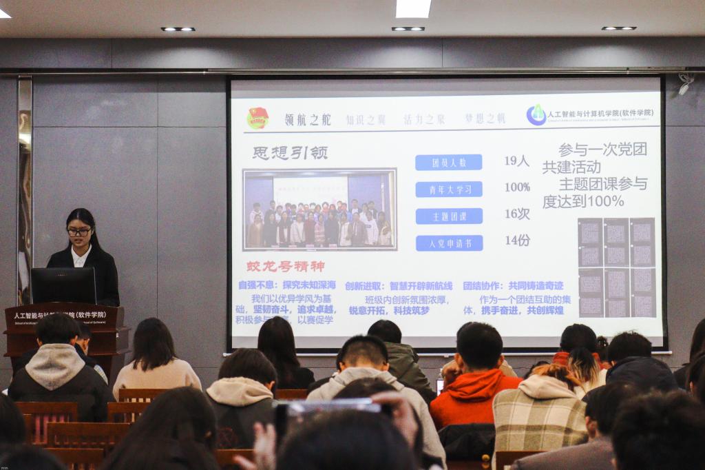 答辩环节,各参选团支部围绕思想引领、制度建设、学风建设和特色活动等方面进行展示,阐述了各自的优势和特点,并对对未来工作进行了规划和设想。经过评选,数媒2304团支部当选为“蛟龙号”特称团支部,人工智能2301团支部当选为“远望号”特称团支部,计科2304团支部当选为“雷锋”特称团支部,人工智能2304团支部当选为“瞿秋白”特称团支部。